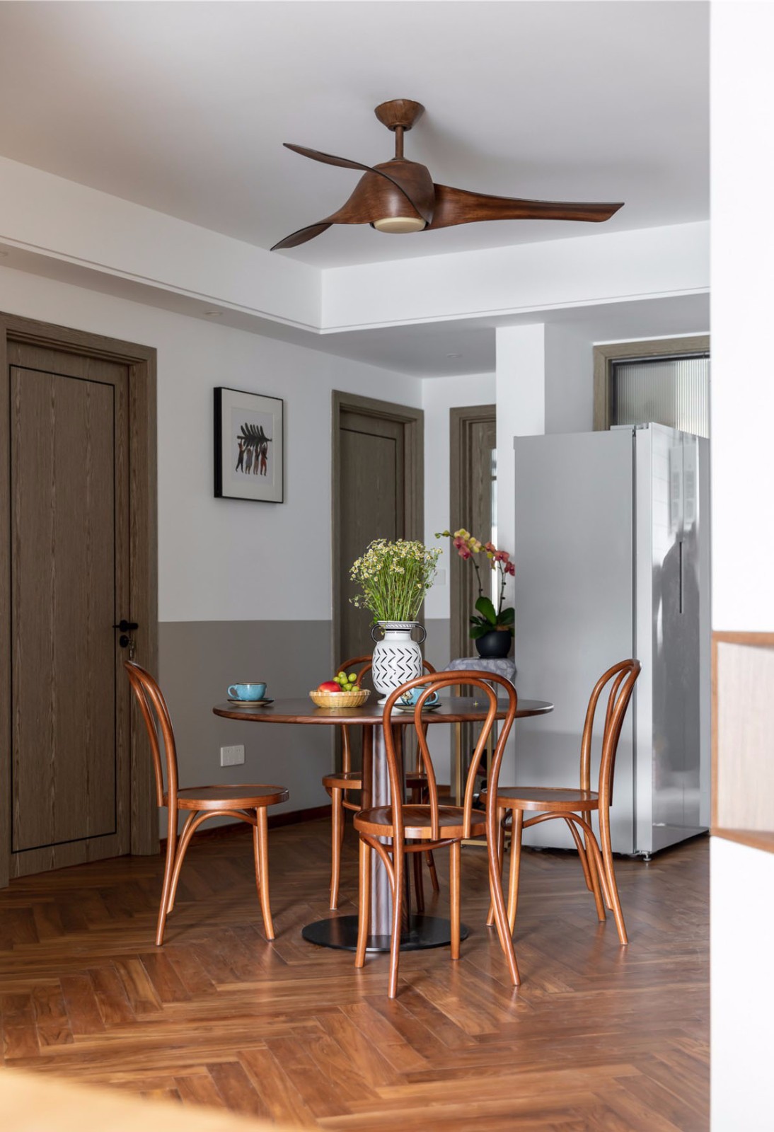 餐桌是温润的樱桃木原木,呈现大面积的山形纹理,清晰又好看,触感细腻,增加用餐时的视觉享受。