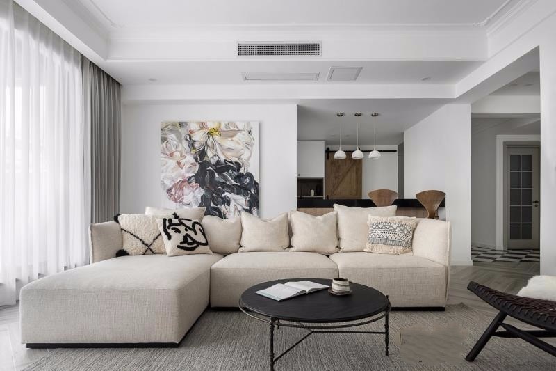 客厅沙发与背景墙统一米白色,纯净简单