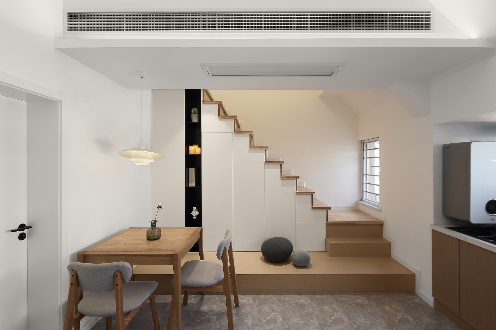 本案原始的户型其实是很不好的,是一个老小区的学区房,房屋因年限太久本身存在很多的问题。房型是6楼顶楼的复式,带有一个小阁楼,坡顶结构而且坡度很大,2楼层高最矮的地方只有20厘米,这么狭小的空间会感觉非常压抑闭塞。