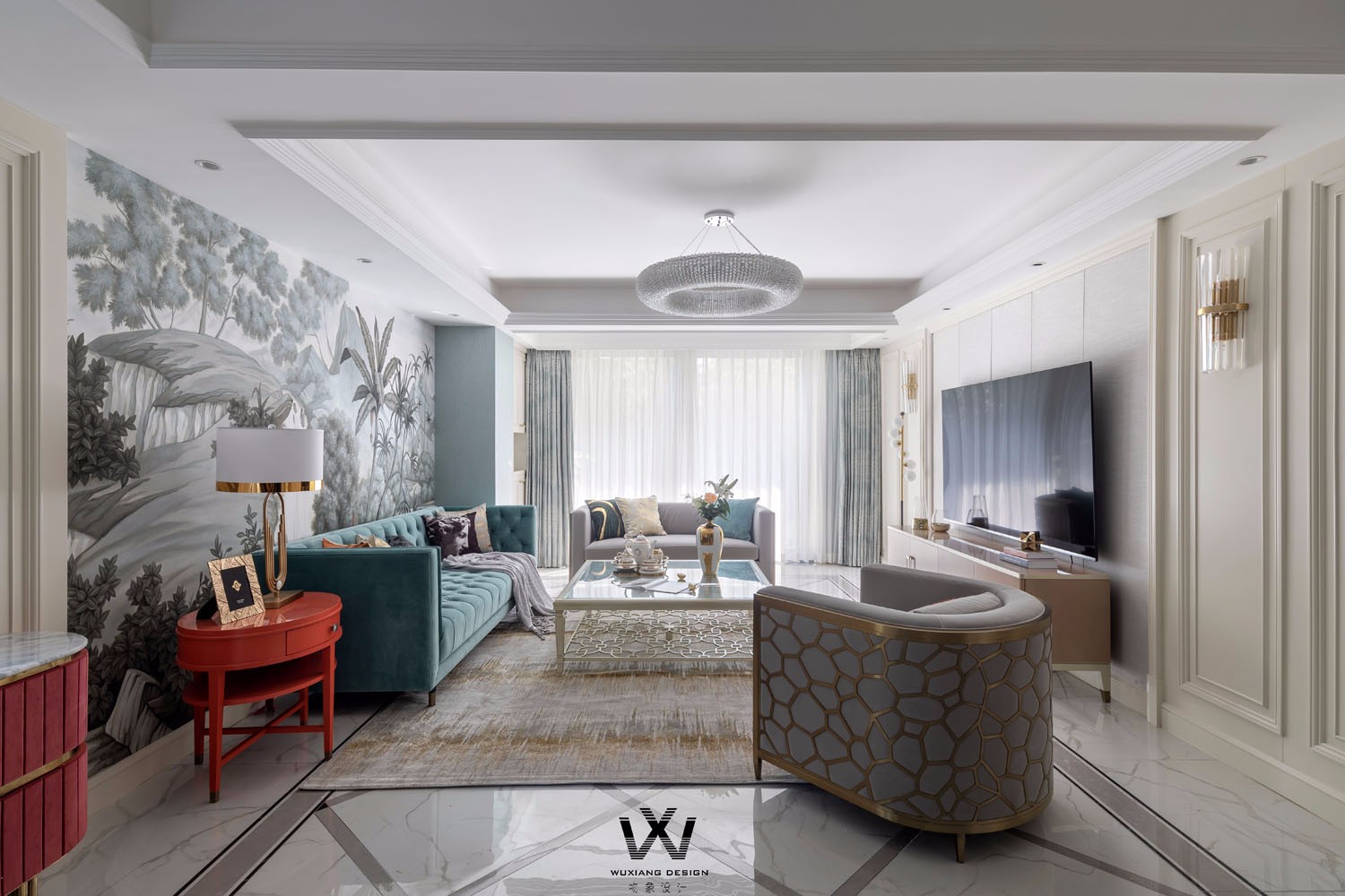 慵懒的周末,明媚阳光穿透落地窗,给室内空间镀上了点点光晕,绿意洋洋的墙绘植物仿佛扭起了小腰。
