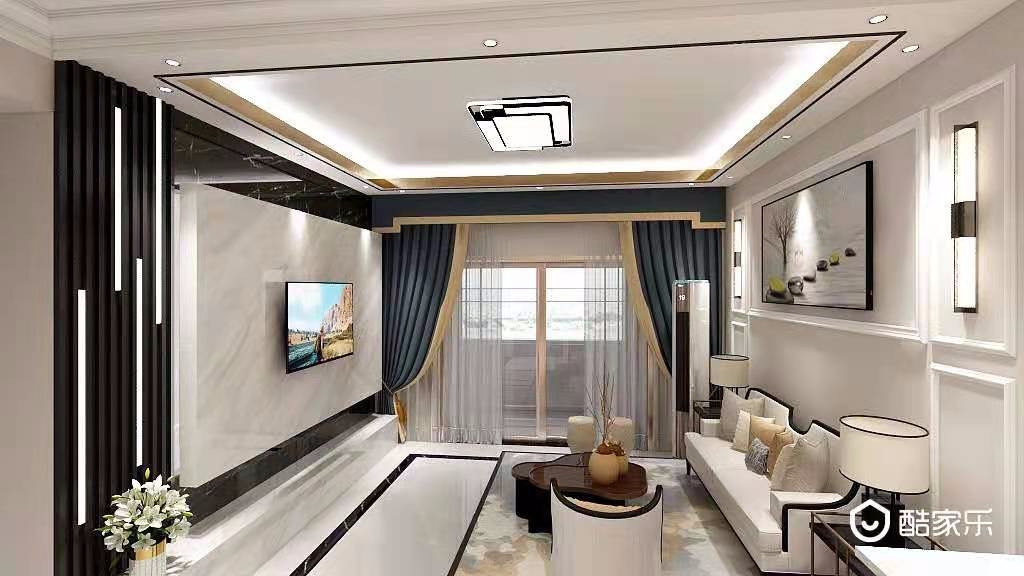 电视背景墙做的较流行悬空背景墙,带氛围灯很温馨,沙发背景做石膏线简单点缀,墙面浅灰,年轻人比较喜爱
