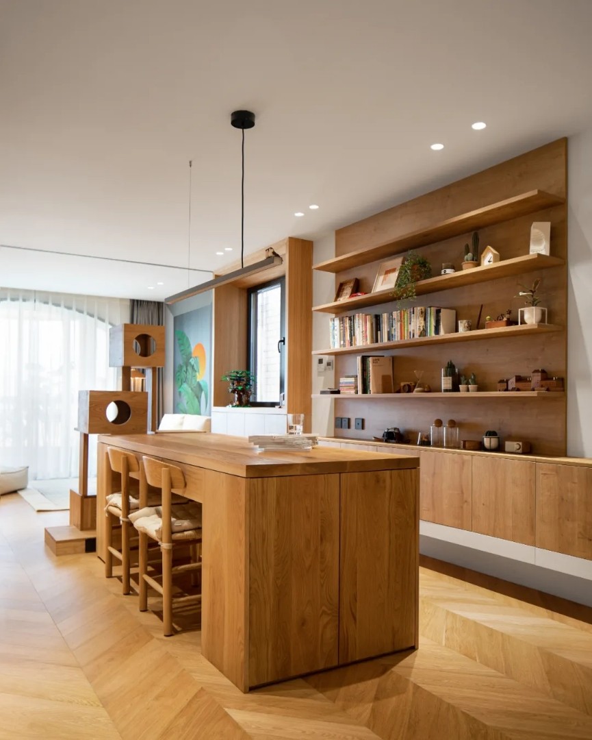 斜对面是电视,正对面则是从电视下方延伸过来的一整排柜子,上方用木隔板做置物架,除了放书也能用来展示女主人的各种手工作品。 单独划出一个区域给猫使用,定制爬架以不同形式的盒子组成,满足了主子的运动需求。