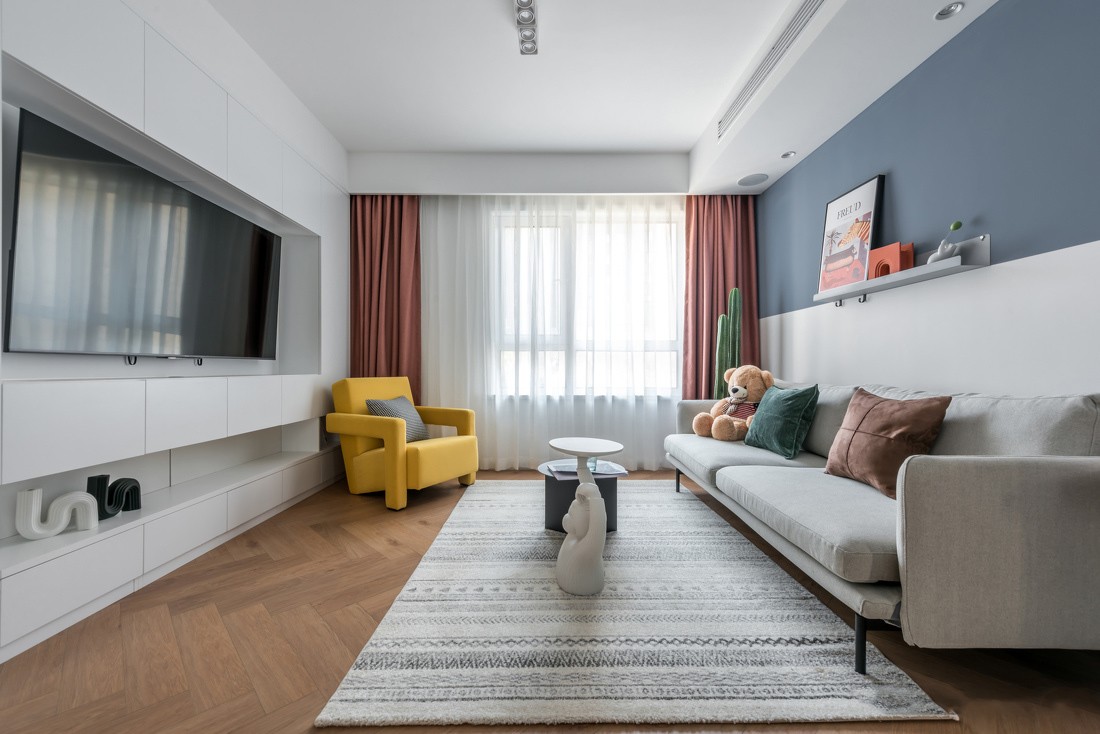 考虑到男生比较理性、沉稳,设计师特意采用了静谧蓝的墙面,奠定整间房子的色彩基调。但为了避免空间过于冷硬,只在墙面的上半部分选择了蓝色。搭配上灰色布艺沙发,让空间色彩更为柔和,视觉层次更为丰富。