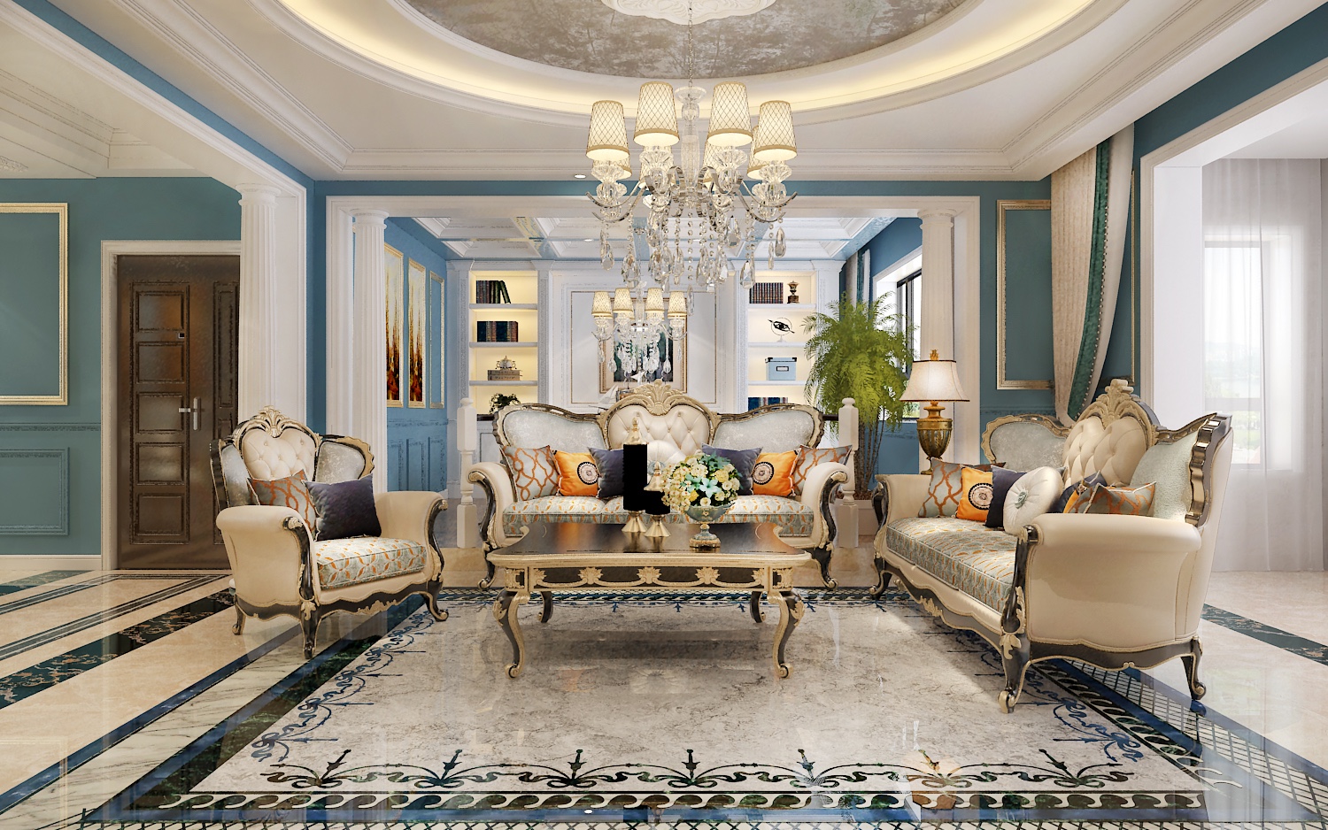 欧式客厅顶部喜用大型灯池,并用华丽的枝形吊灯营造气氛。门窗上半部多做成圆弧形,并用带有花纹的石膏线勾边。室内有真正的壁炉或假的壁炉造型。墙面用高档壁纸,或优质乳胶漆,以烘托豪华效果。