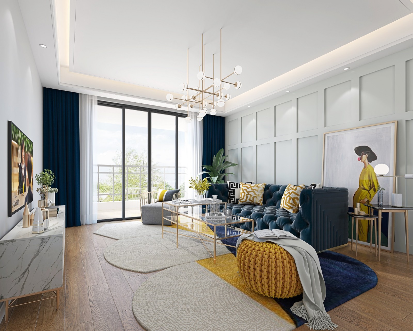 客厅做吊顶,地面铺贴实木复合地板。