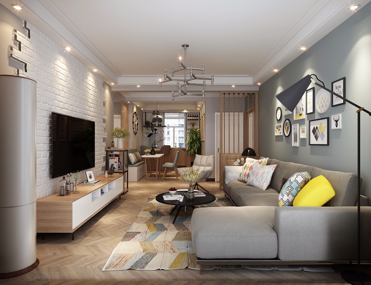 电视墙采用浅色砖纹设计,艺术感***极强