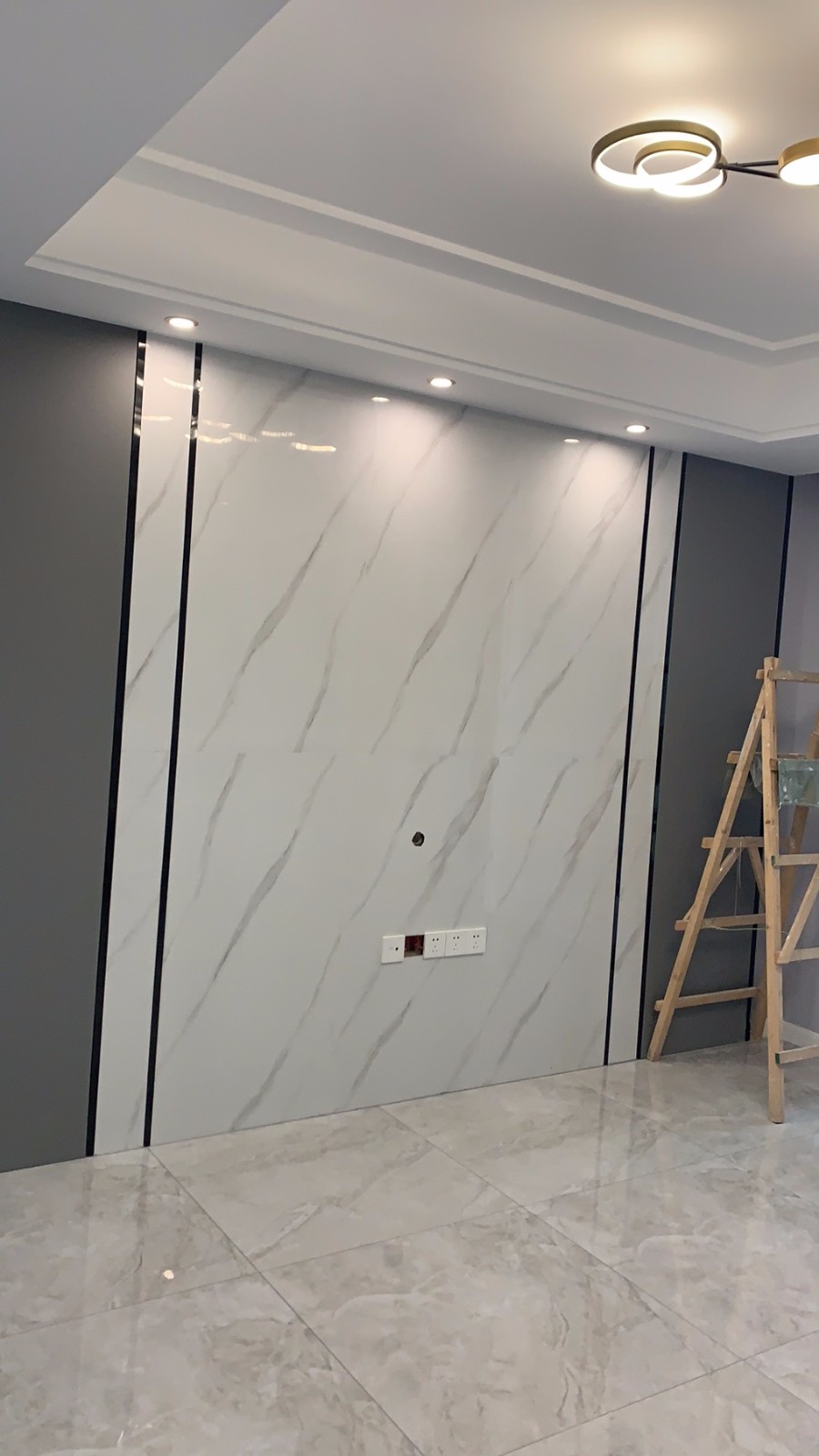 客厅背景墙利用瓷砖仿佛是大理石;旁边有软包线条;