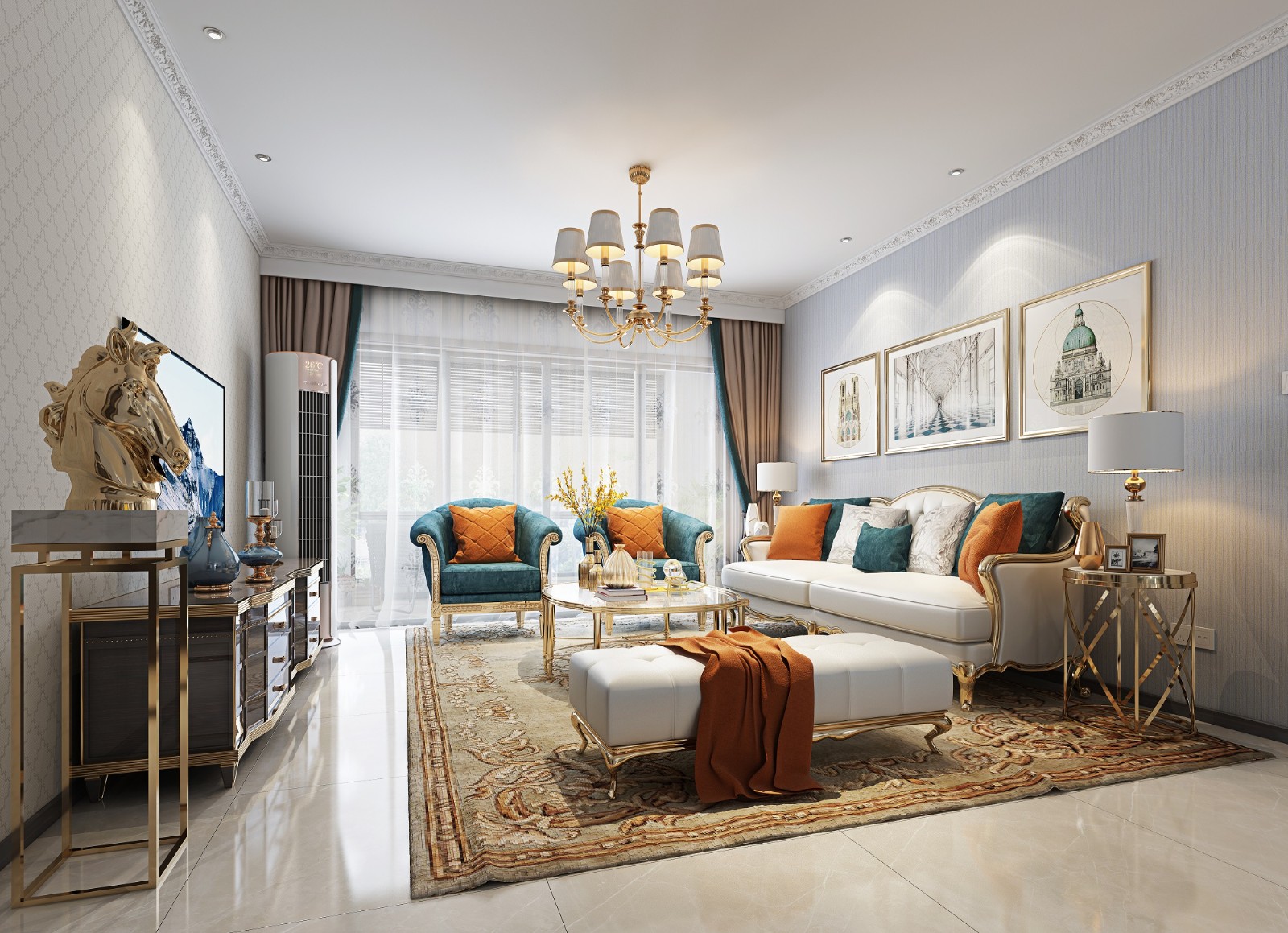 房型信息三室两厅两卫,业主要求大气,偏爱轻奢风家具所以设计师推荐美式轻奢风。