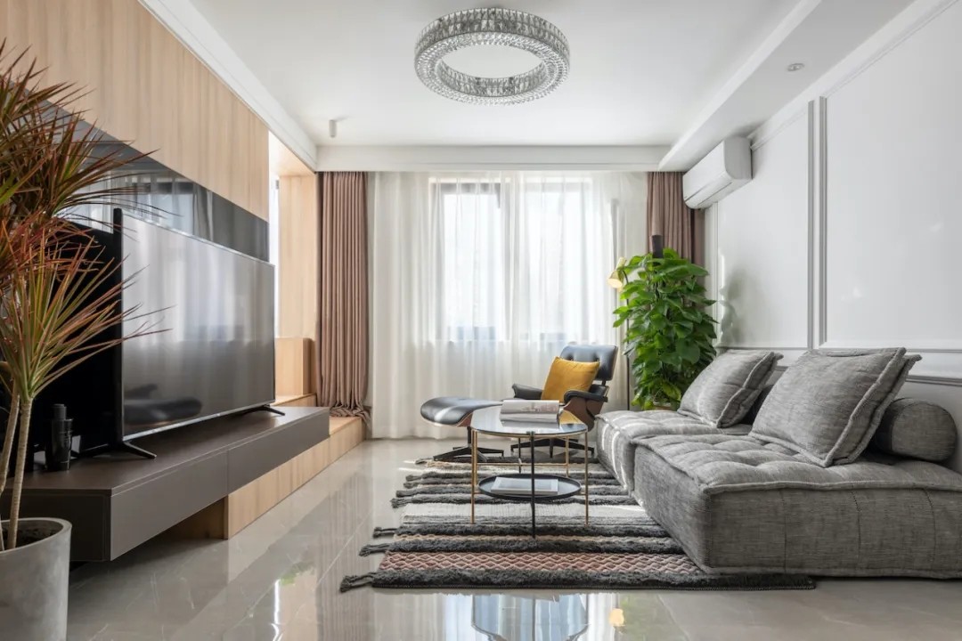 客餐厅一体化设计,将两扇卧室门巧妙地隐藏其中,延伸到了阳台区域,非常整体,形成了独特的景观轴。