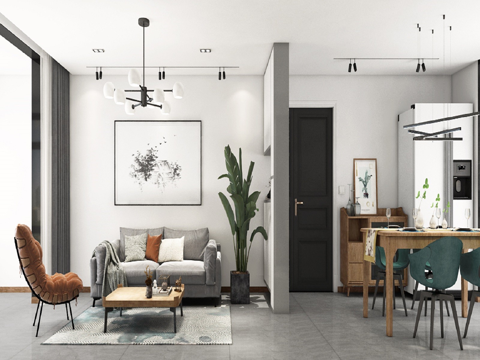 客厅整体布局清新淡雅,入户右边做了一排通顶鞋柜,规避了一进门就能看见客厅区域,墙面是用白色乳胶漆地面则是用灰色地砖相呼应,家具上面的搭配也是很让人舒心,灰色的双人沙发,外加一个面包单椅,旁边的绿植也给整个空间增添了那么一丝大自然的气息。