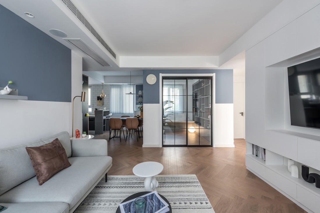 考虑到男生比较理性、沉稳,设计师特意采用了静谧蓝的墙面,奠定整间房子的色彩基调。但为了避免空间过于冷硬,只在墙面的上半部分选择了蓝色。搭配上灰色布艺沙发,让空间色彩更为柔和,视觉层次更为丰富。