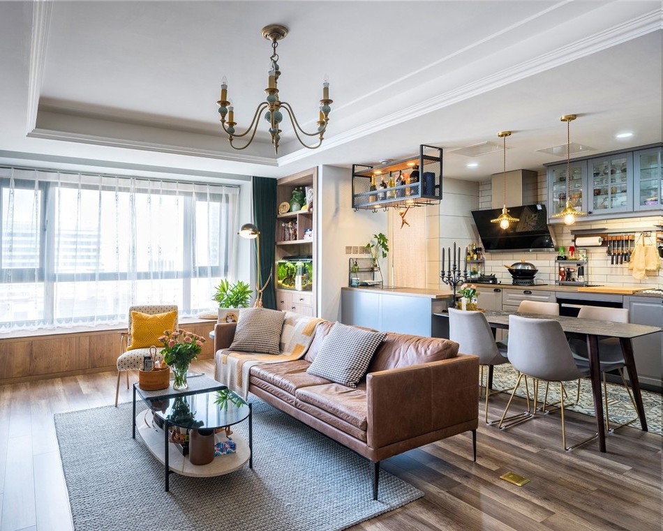 本案改造后为二室一厅两卫,厨房改为开放式。以冰箱为界,左侧是客厅,右侧是厨房;原来非常狭小的阳台,现在也是洗衣机、烘干机、抹布池、工具柜一应俱全;客厅的地台放着孩子的玩具,平时孩子在客厅玩玩具,夫妻二人在厨房忙碌,非常温馨,夜幕降临,在地台上坐着,喝着红酒,望着窗外,相当惬意。