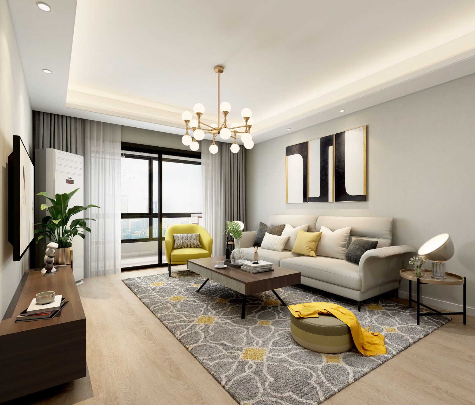 房型三室两厅两卫,业主要求现代简约风格,简洁耐看,不喜欢复杂造型。