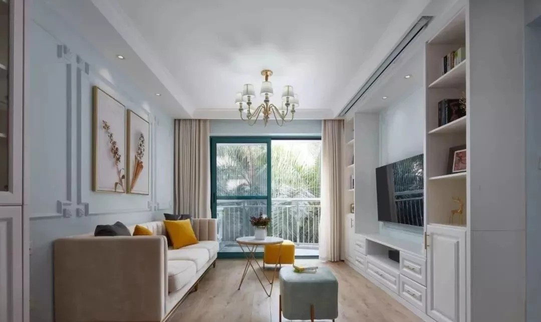 在餐厅的另一侧就是客厅空间了,客厅的电视背景墙也是做了储物柜的设计,搭配一些开放式的搁架,摆放一些装饰品、书籍等更有格调感。