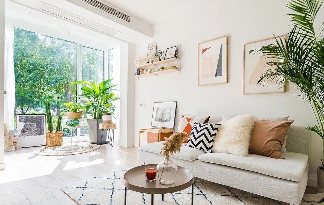 客厅打通阳台后采光一下明亮了许多许多,客厅整体运用了温暖的色调,木色元素搭配烟粉色和橘色,整体清新灵动又优雅。