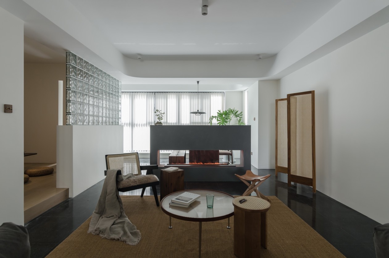 客厅西立面。实木、藤编、皮革、火炉传递出诗意的气息,深色水磨石温润而克制。
