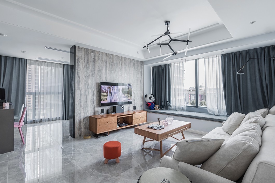 整个客厅空间采用非常简单的浅色系,浅灰色大理石纹的地砖让空间更加通透,敞亮。米白色布艺沙发搭配原木色的家具,一股清新简单的北欧风迎面而来。