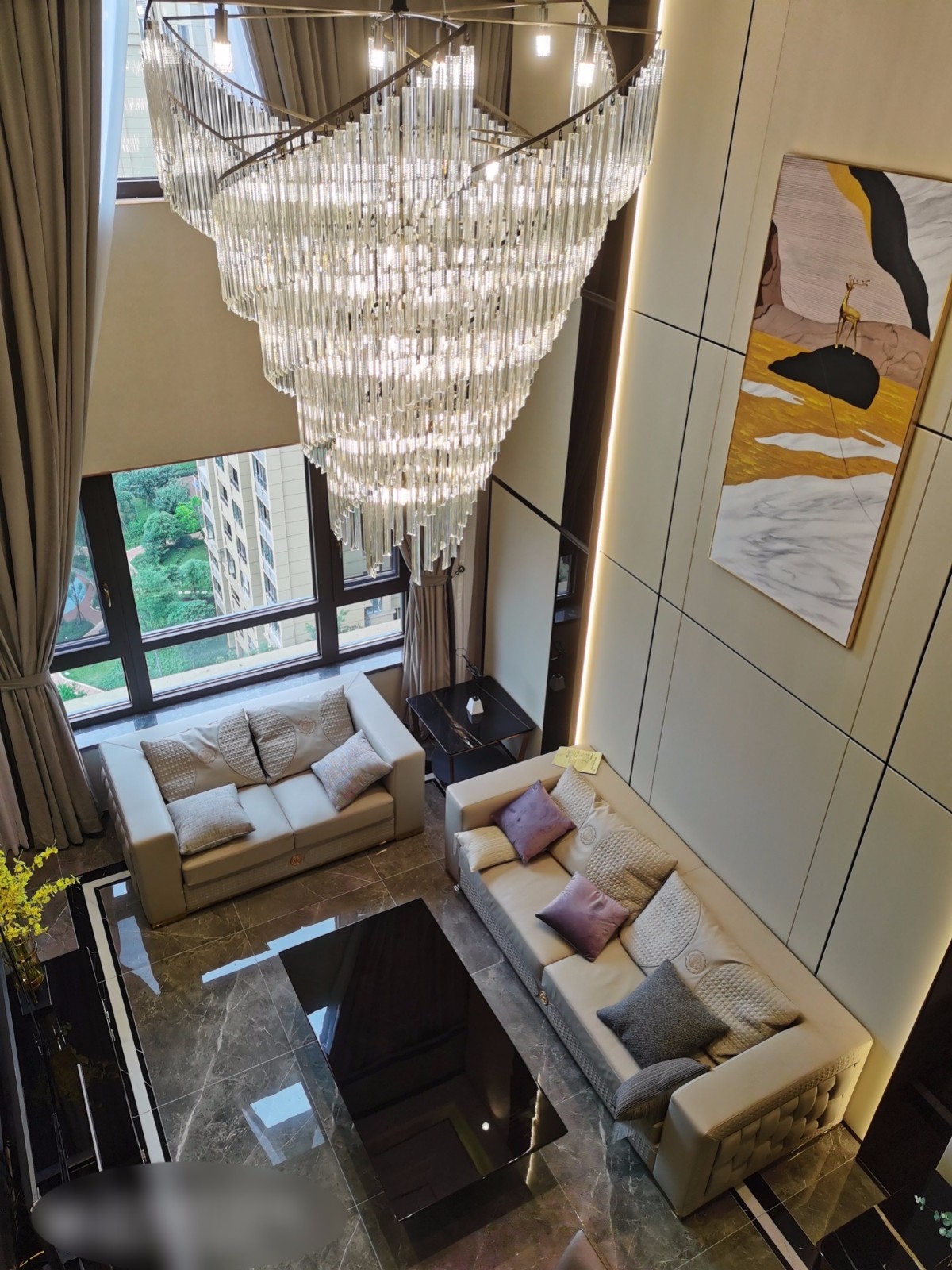 定制石材电视墙增加客厅质感,有较大的采光面,通风效果较好