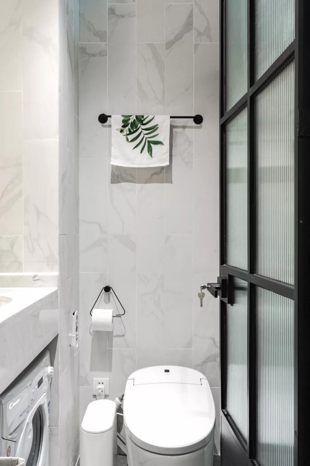 卫生间的铁艺凹凸质感玻璃门,和装饰画里的螺旋纹好像相得益彰的标志。