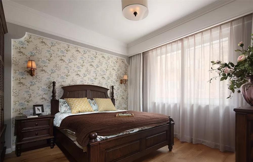 ▲ 主卧床头背景选用碎花墙纸,配以棕色床架与美式壁灯营造温馨的睡眠环境。