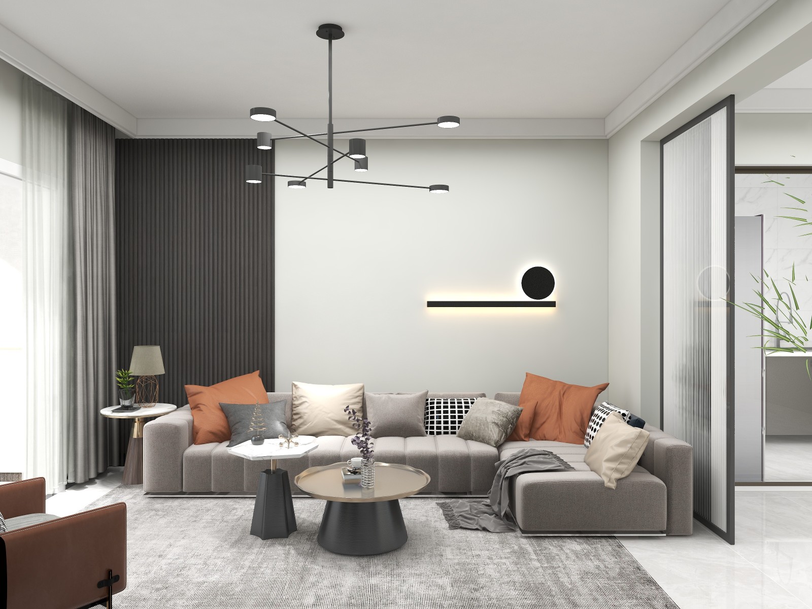 背景墙采用黄金分割手法用格栅板和留白做对比,整个空间的设计感十足。