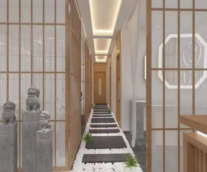 金属面的装饰更显档次,和灯光结合,地面的鹅卵石搭配