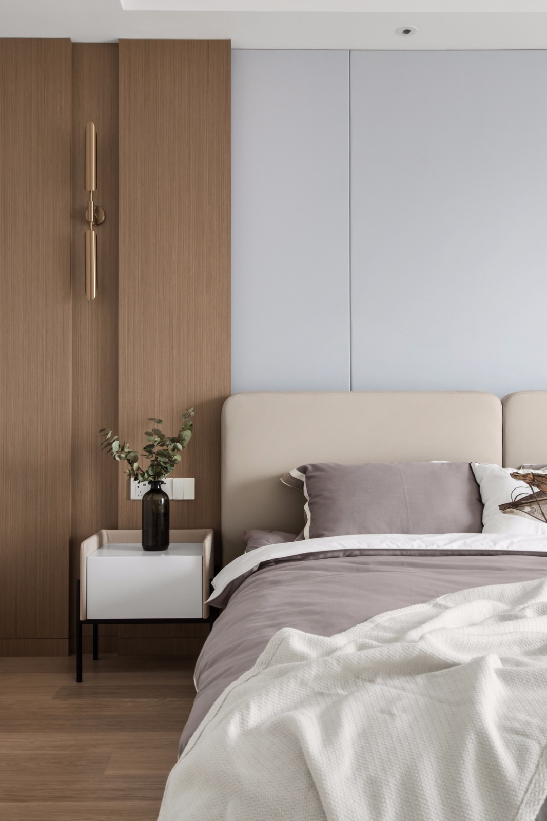 主卧比较宽敞,而且采光也是非常的好。 整个卧室的装饰主要集中在床头背景墙,是硬包+木饰面的搭配,床头两侧是彼此对称的木饰面墙,特意留出凹槽位搭配壁灯,这样更有层次感。