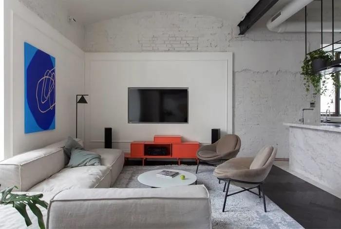 ▲工业风的客厅,电视墙在毛坯砖基底上,装上一块护墙板作为背景墙,壁挂上电视机,布置一个红色电视柜,侧边墙面挂一幅蓝色的装饰画,在工业风的空间下,布置红蓝配的强烈对比设计,布置上现代舒适的布艺沙发,整个空间都显得更加时尚***。