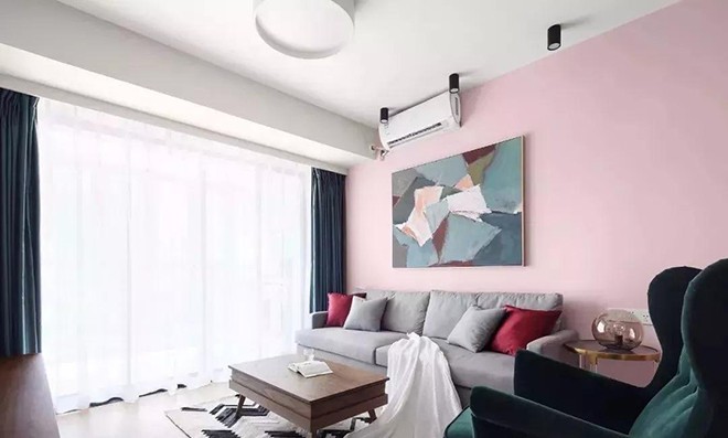粉红色的沙发背景墙配上一幅抽象画作,让原本略显冷清的空间突然就变得浪漫起来,再加上格调感满满的单椅、窗帘,客厅的设计非常时尚。
