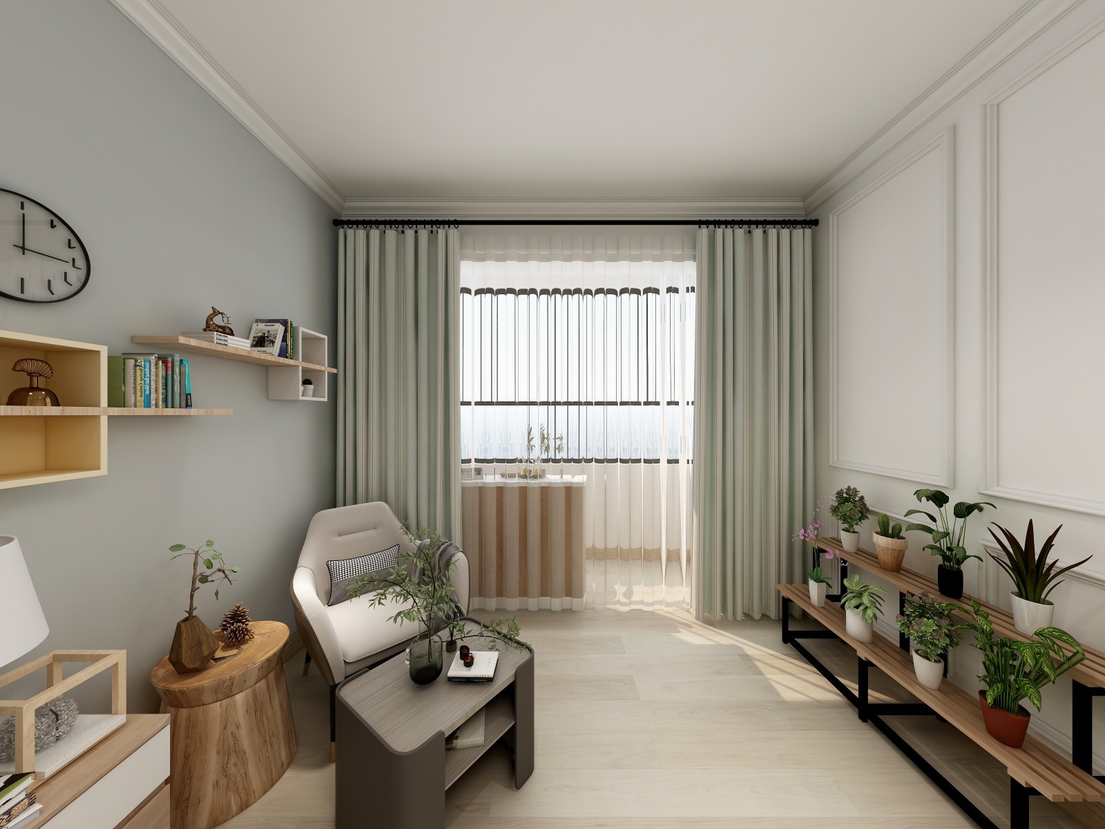 主卧简约清新,浅灰色的墙面搭配莫兰迪色系窗帘,营造舒适安静的睡眠环境