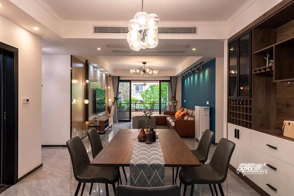 加长的实木餐桌,简单实用,配合分子吊灯,视觉上质感十足。