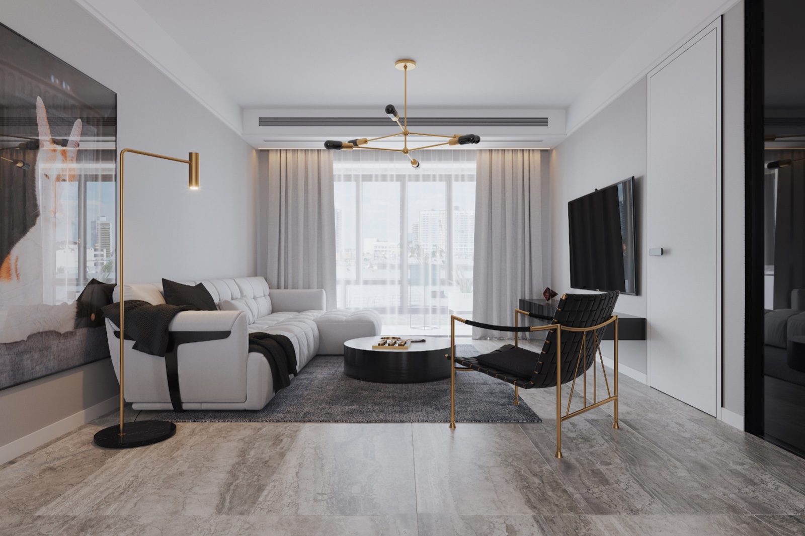 业主喜欢暖色系,平时穿搭也是比较优雅和时尚。色彩上黑白灰为基础,搭配金属点缀,活泼时尚,希望达到一个有温度有深度的家的效果。