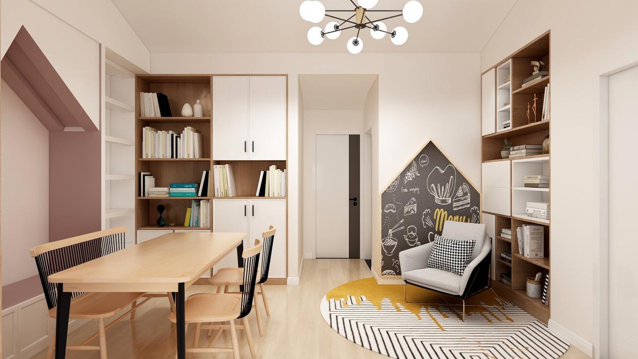 客餐厅整体采光通风不是很好,所以整体的色调选的是比较清晰自然地,一整墙的大书架也是给爱读书的一家的读物给与了一个“小窝”,简单的桌椅、灯具组成一个简洁的餐厅,在这儿忘记城市的喧嚣,只享受在这片静怡的意境之中。用自然和可持续的材料制成的家,成了自然体验感受的庇护所。空间似乎在倾听我们内心深处最深刻的需求。