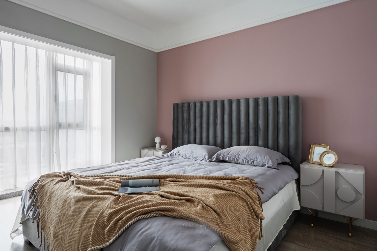 卧室不需要太多的设计技巧,它只要保持***的舒适就好;粉与灰的配色满足视觉舒适;丝绒的床头与实用的大衣柜,完善身体舒适;阳台虽然不大,却是现实里的“诗和远方”。