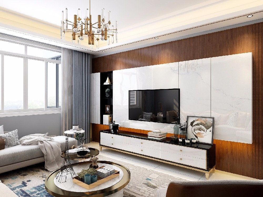 客厅大理石背景墙与木饰面的结合,干净而不失优雅与华丽气质
