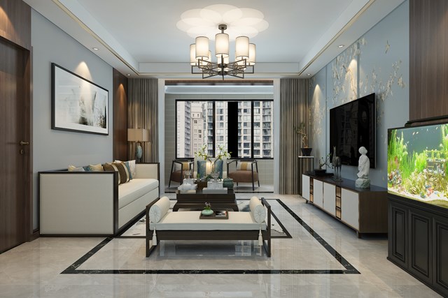 客厅以一些简约的造型为基础,添加了中式元素,使整体空间感觉更加丰富,大而不空、厚而不重,有格调又不显压抑