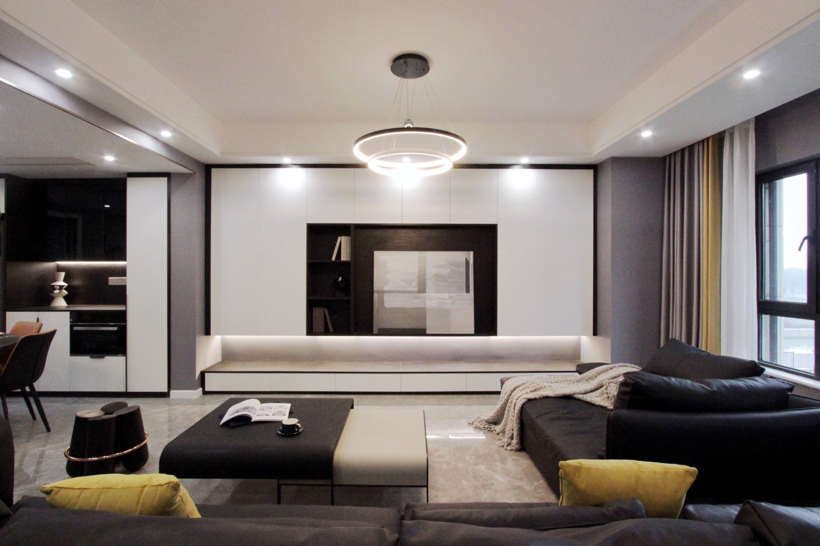 黑白灰低调沉稳,明黄色点亮空间。 客厅空间利用灯光中和整体色调,打造冷静沉着的质感空间。