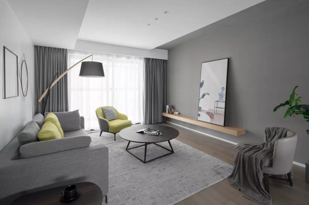 电视背景墙也是选择了整体刷上灰色的墙漆,设计师用一块隔板代替电视柜,上方用装饰画代替电视,让人感觉更加文艺和简洁。