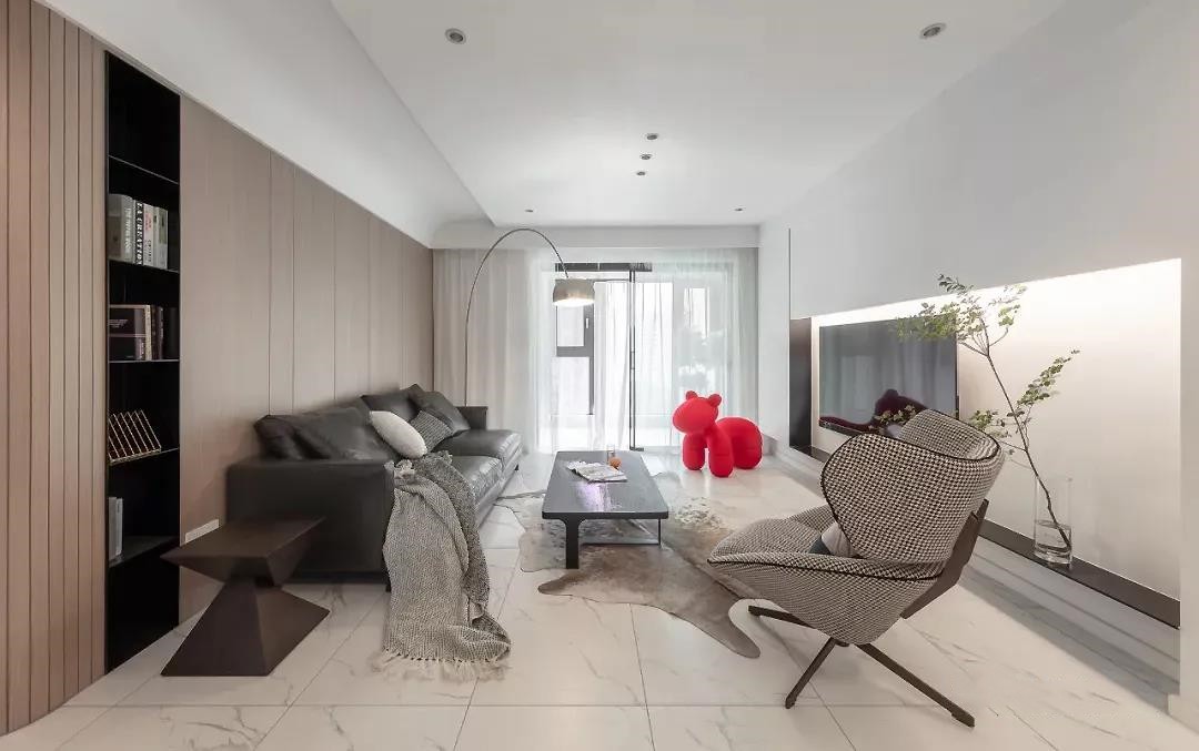 客厅,地面材质选用白色带有清雅纹理的地砖,沙发背景以木质护墙平衡空间的温感。