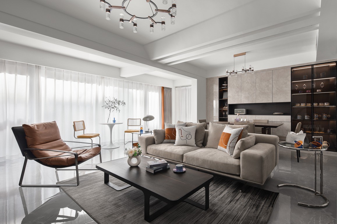 本案采用驼色、灰色装饰展示出一个自然而温暖的空间,从入口到过道客餐厅,混合棕色,白色,灰色家具营造出一种自然而奢华的气氛,简单的艺术品及绘画配合让空间具有独特、温暖的居家氛围。