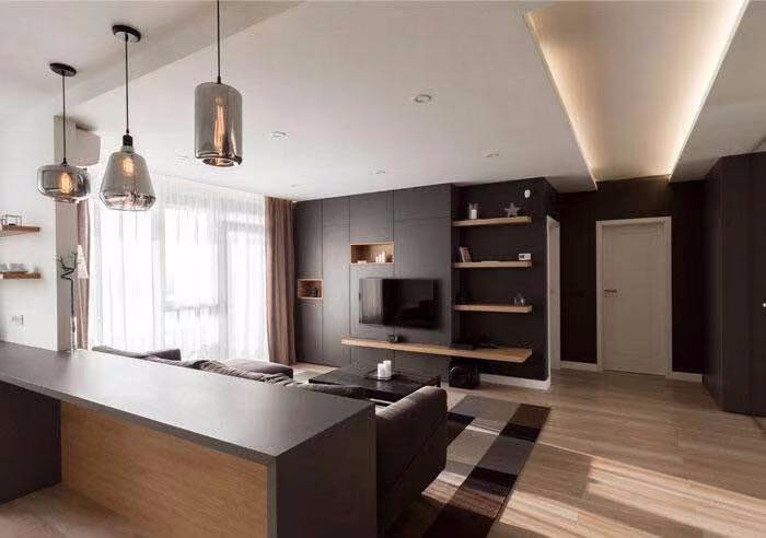 客厅深色背景墙,木饰面,暖灰色地板。