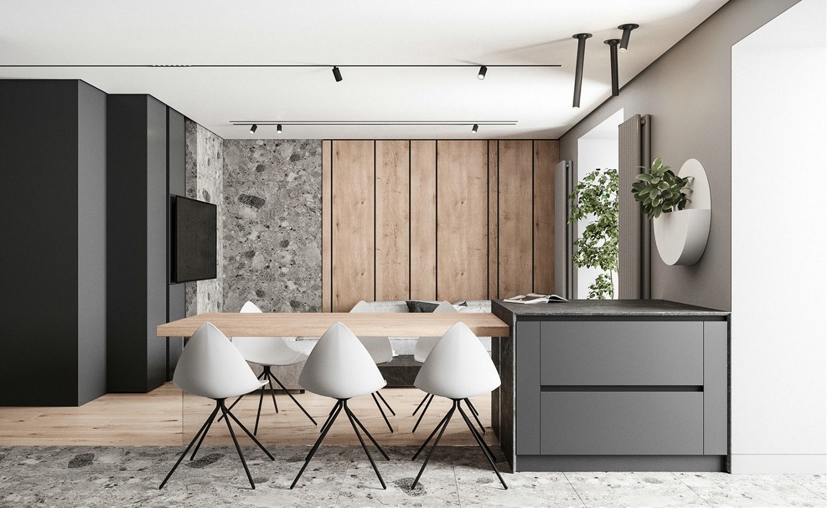 客餐厅一体化设计,空间以浅灰色为主调,加入原木色实木地板和家具,为空间添暖意。
