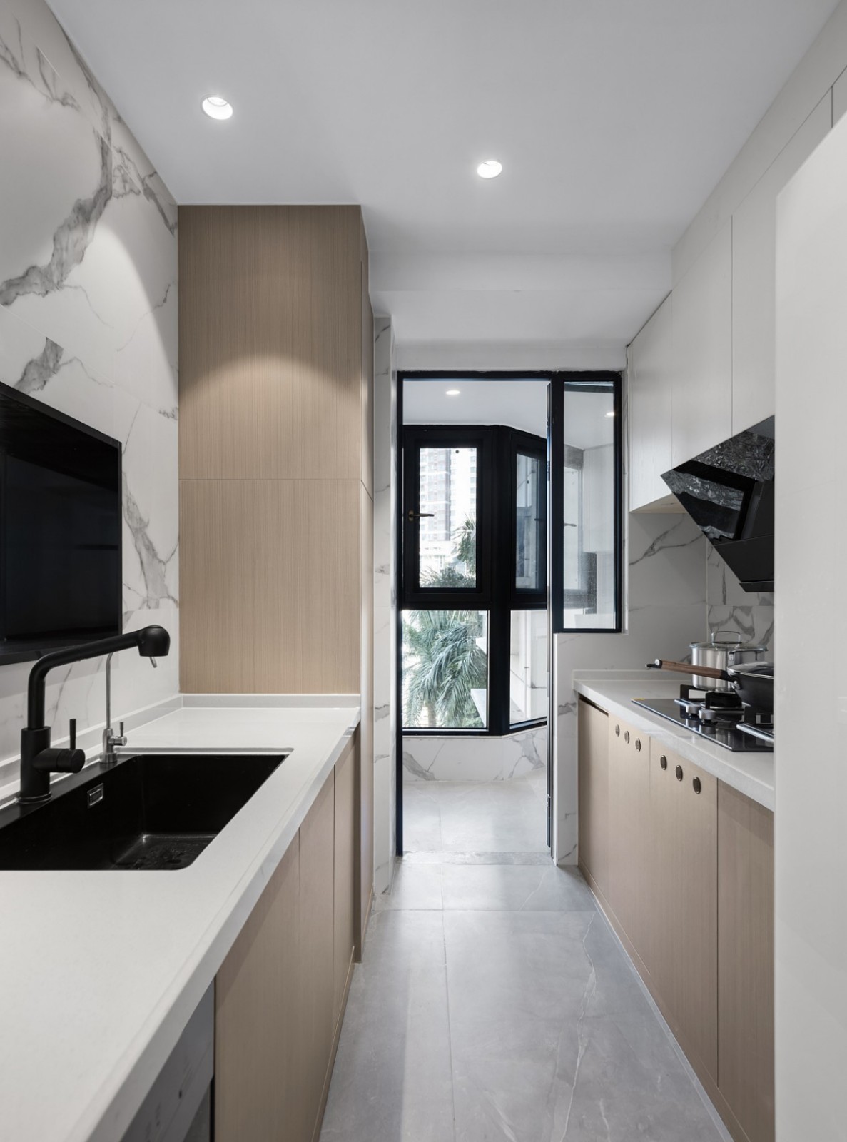 厨房使用了玻璃推拉门,整洁干净的厨房,是我们的追求