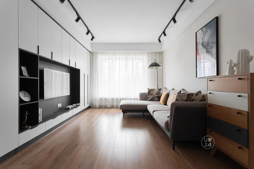 然后将吸顶灯换成轨道射灯,将单点位照明变为多点位照明,同时沙发旁还增加了钓鱼灯。光线不再单调,空间氛围才更易打造。