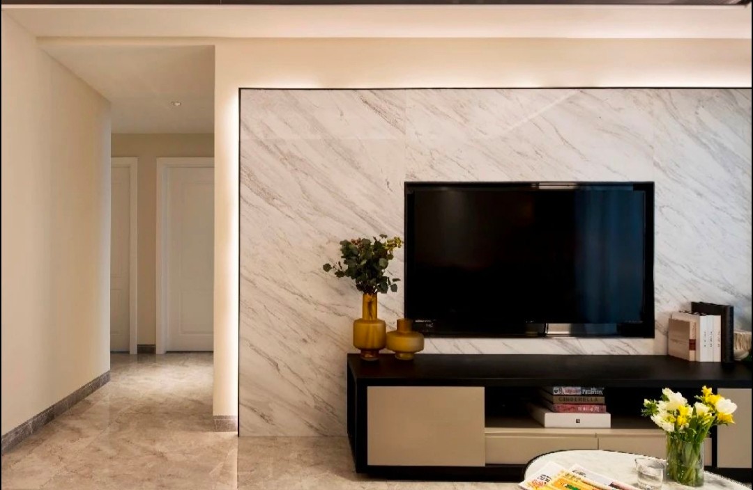电视墙由3片完整的爵士白大理石拼接而扯那个,背面搭配了隐藏式灯带。