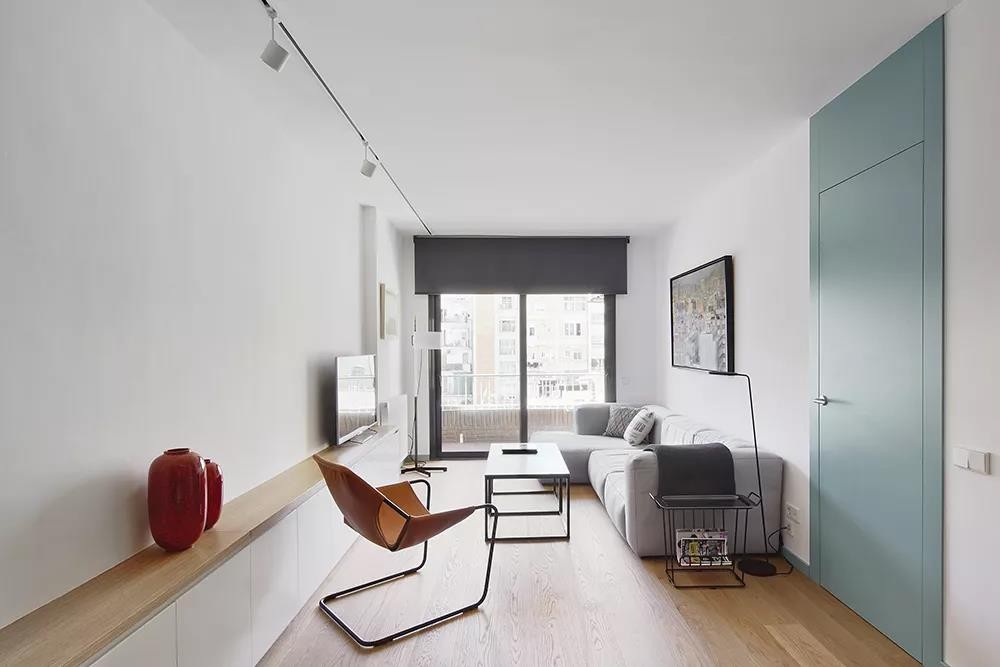 客厅的电视墙,设计师选择了留白,有的时候,适当的留白反而更能凸显气质。极具线条感的落地灯、椅子和茶几等,为客厅增加了现代艺术感。