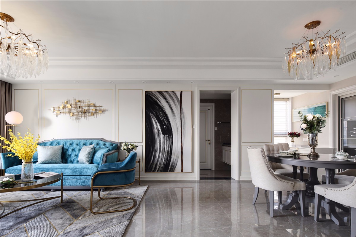 整体风格偏向于美式轻奢,客厅背景墙护墙板加金属线条。