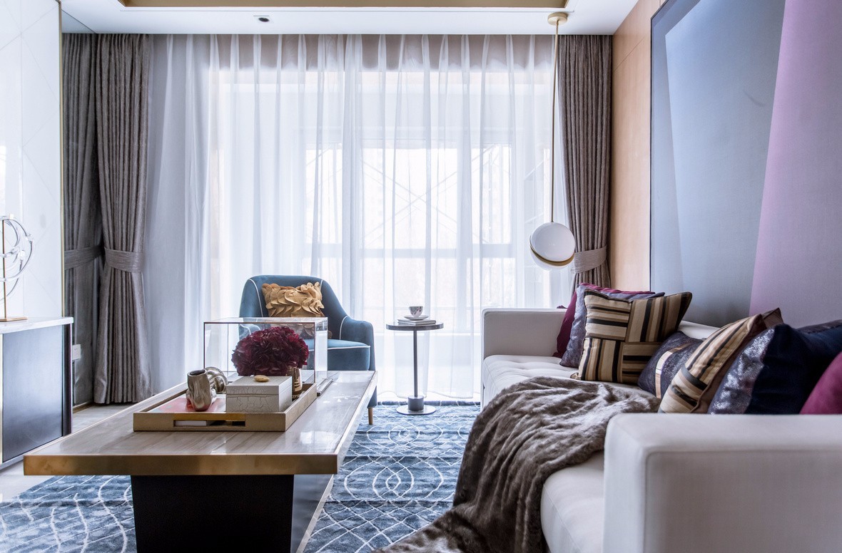 整体采用明亮色系搭配,用深紫色点缀主题,使空间赋予***,神秘,浪漫的感觉。