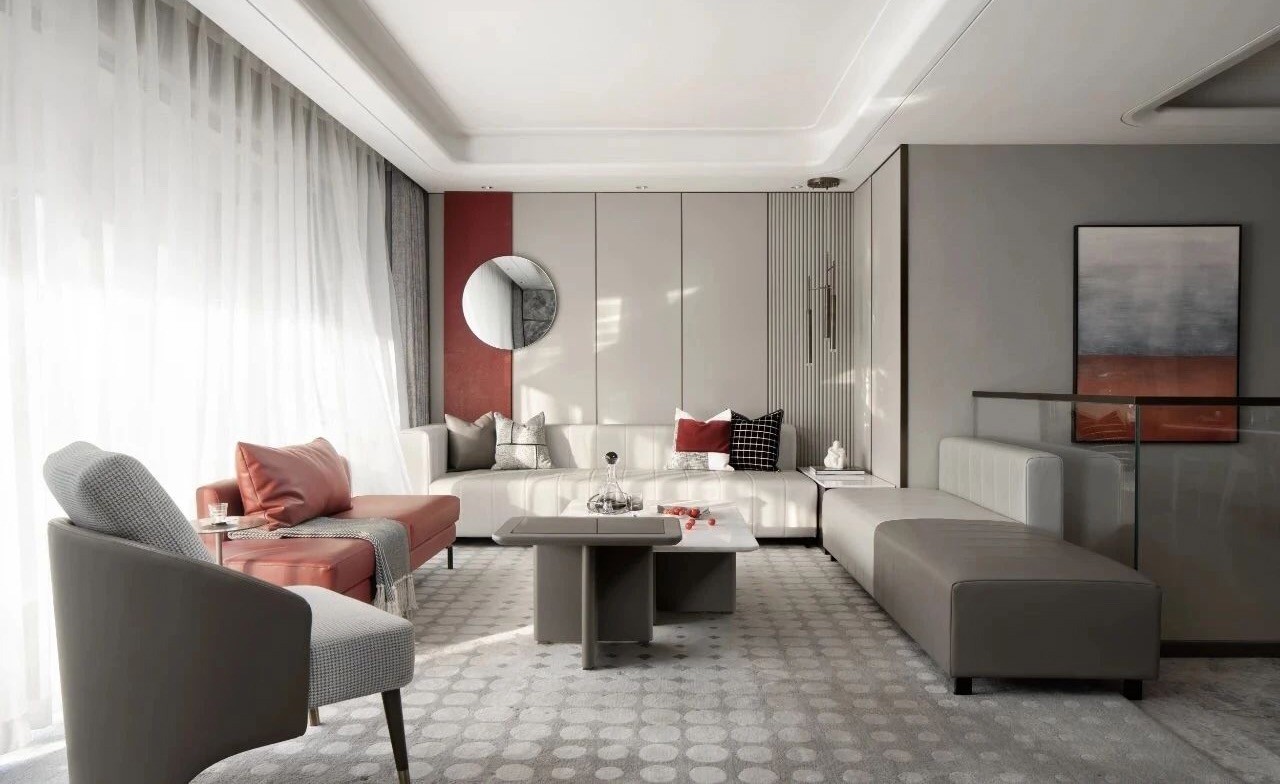 设计在空间中产生和谐韵律和内在秩序。 红白灰与极具现代感的家具想结合,皮革与棉麻有着对立的戏剧性,在自然光的调和下呈现出丰富的表情。