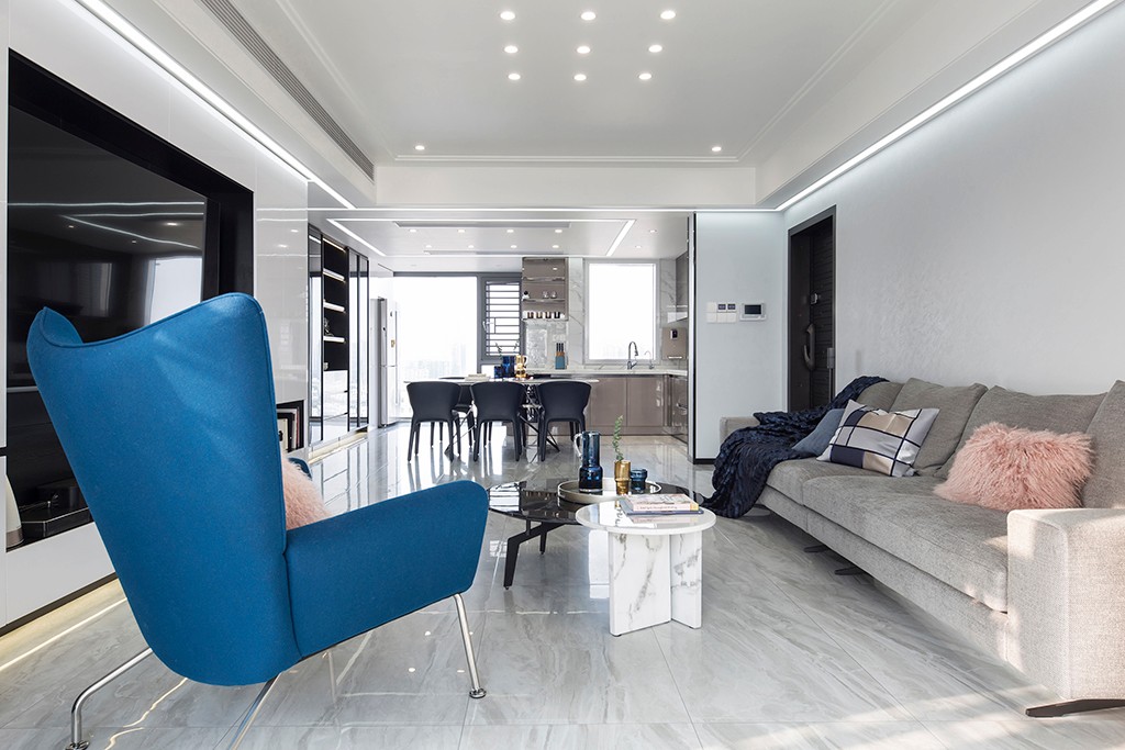 客厅以白色为主,灵活搭配灰色与蓝色,在色调的深与浅之间,空间更显通透、宽阔、明亮。